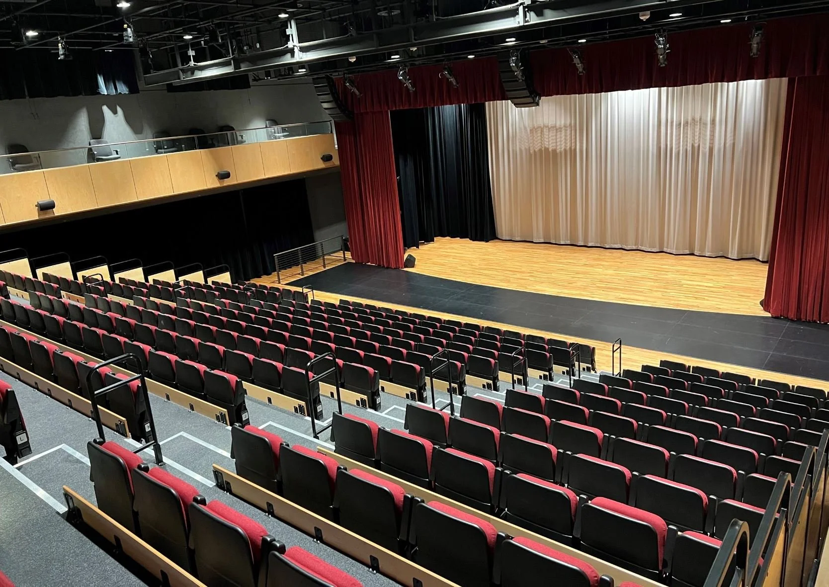 Stadium seating for 338 attendees with full lighting and sound capabilities.